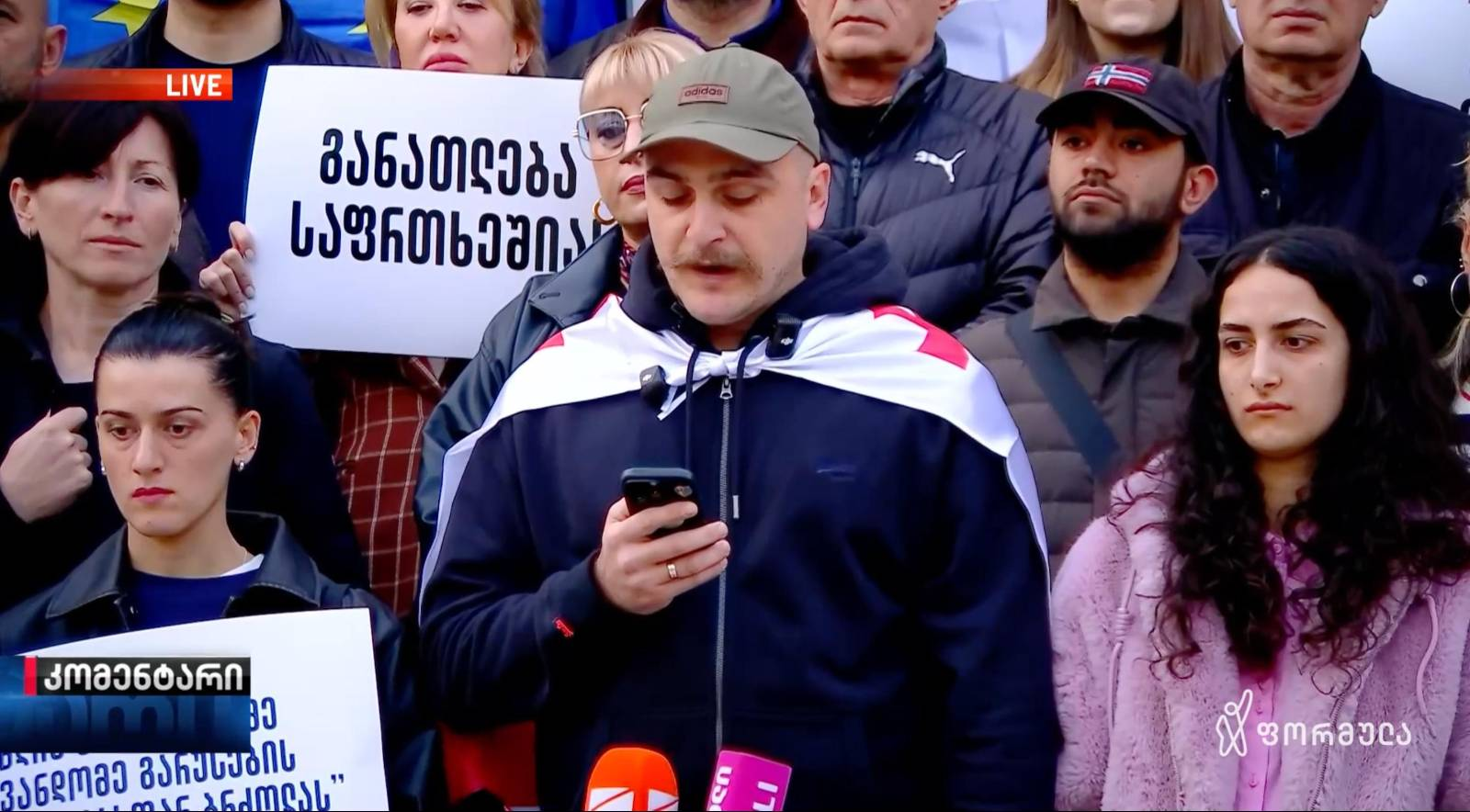 “For a year now, the Georgian people fighting for freedom have responded to the regime taking individuals hostage, the degrading treatment and torture of many of them, with continuous and determined resistance and unwavering solidarity toward one another,” said activist Levan Jobava as he read the statement.