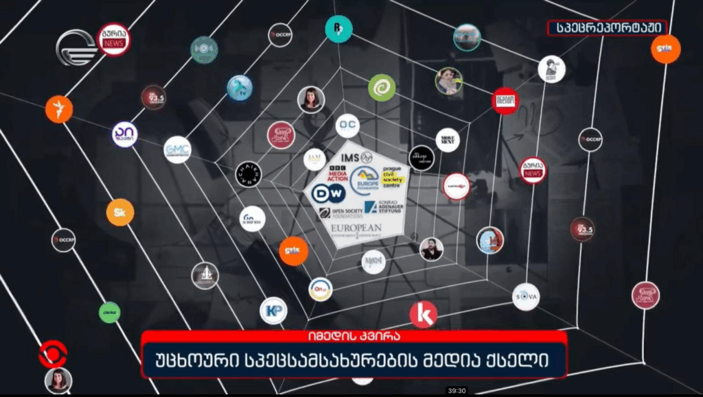 Imedi TV relied on dramatic visuals to promote what it described as a “large-scale scheme” involving an “anti-Georgian network operating under the guise of media and serving foreign intelligence services.” The 20-minute segment used multiple graphics to support the narrative, while advancing conspiracy claims that at times contradicted one another – for example, asserting that most journalists are actually NGO employees but also part of a unified secret network linked to a specific journalism school.