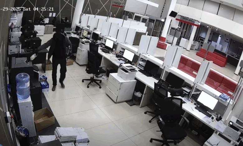 Footage released by the Prosecutor’s Office shows the man arriving at the court chancellery at about 4:10 a.m., followed immediately by separate interior footage showing a person inside the office pouring liquid from two bottles onto desks, documents, and other parts of the chancellery interior.