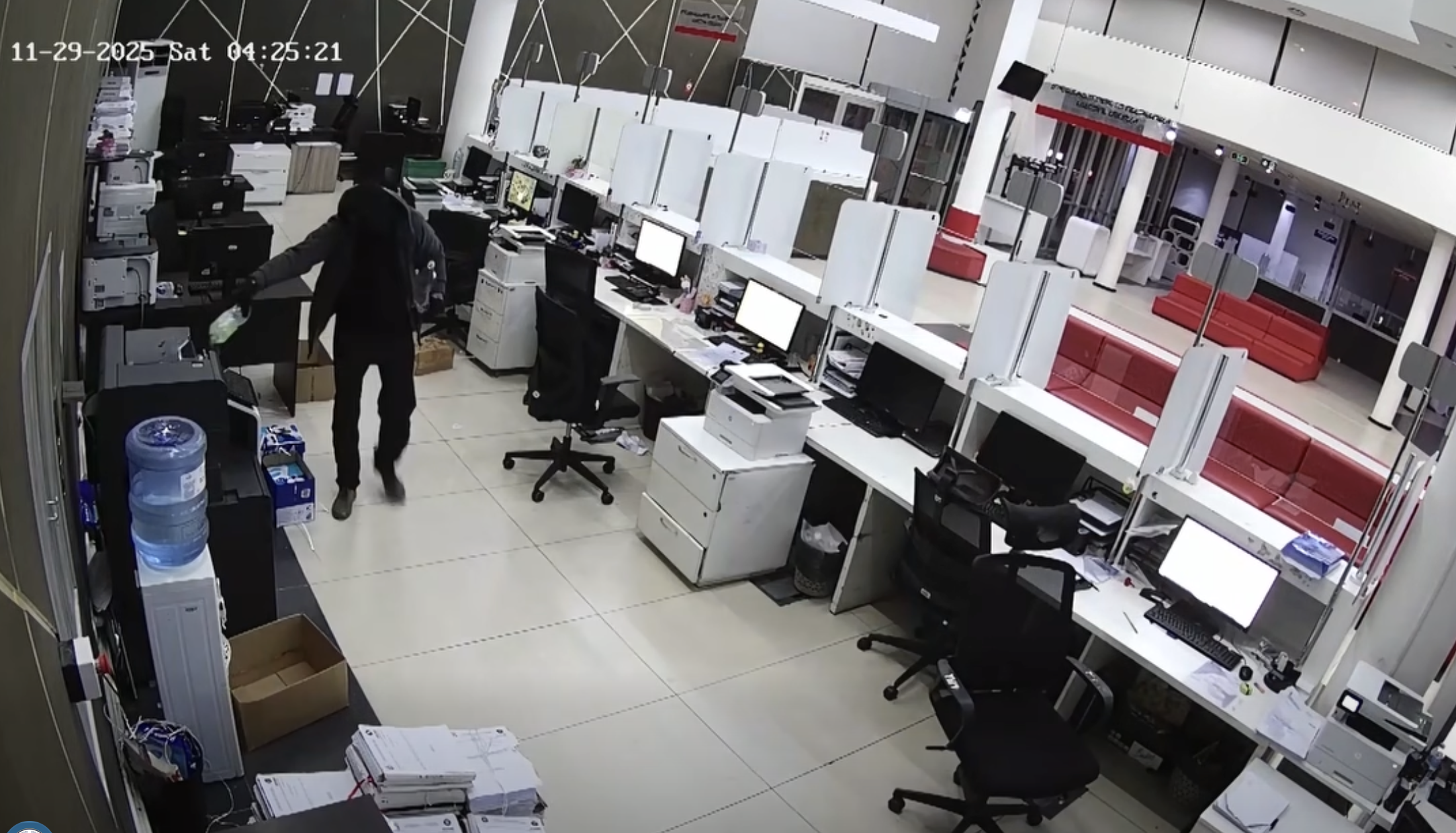 Footage released by the Prosecutor’s Office shows the man arriving at the court chancellery at about 4:10 a.m., followed immediately by separate interior footage showing a person inside the office pouring liquid from two bottles onto desks, documents, and other parts of the chancellery interior.