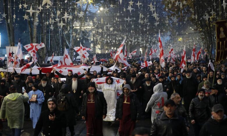 Members and supporters of the far-right Conservatives for Georgia party rallied outside Parliament in Tbilisi on Sunday, December 7, before marching to the Holy Trinity Cathedral, to protest an Emirati investment that they say would lead to the construction of two “Arab cities” in Georgia.