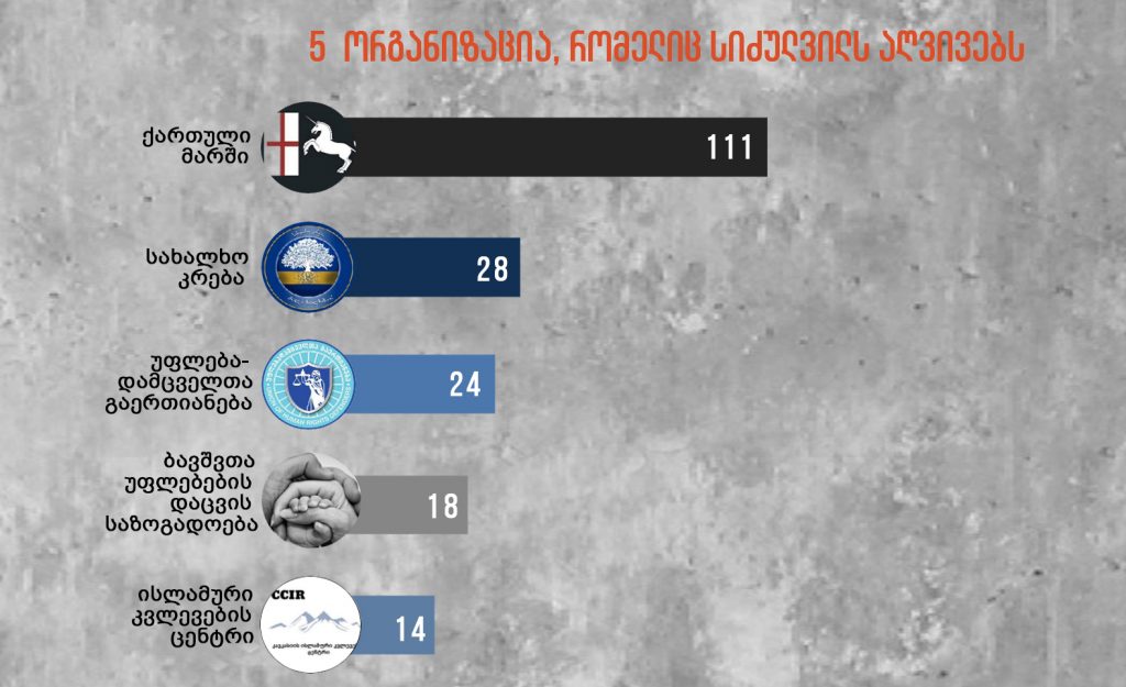ანგარიშში ის ხუთი ორგანიზაციაც არის დასახელებული, რომლის წარმომადგენლებიც სიძულვილის ენის შემცველ კომენტარებს აჟღერებდნენ. ესენია: ქართული მარში, ბავშვთა უფლებების დაცვის საზოგადოება, სახალხო კრება, უფლებადამცველთა გაერთიანება და კავკასიის ისლამური კვლევების ცენტრი.