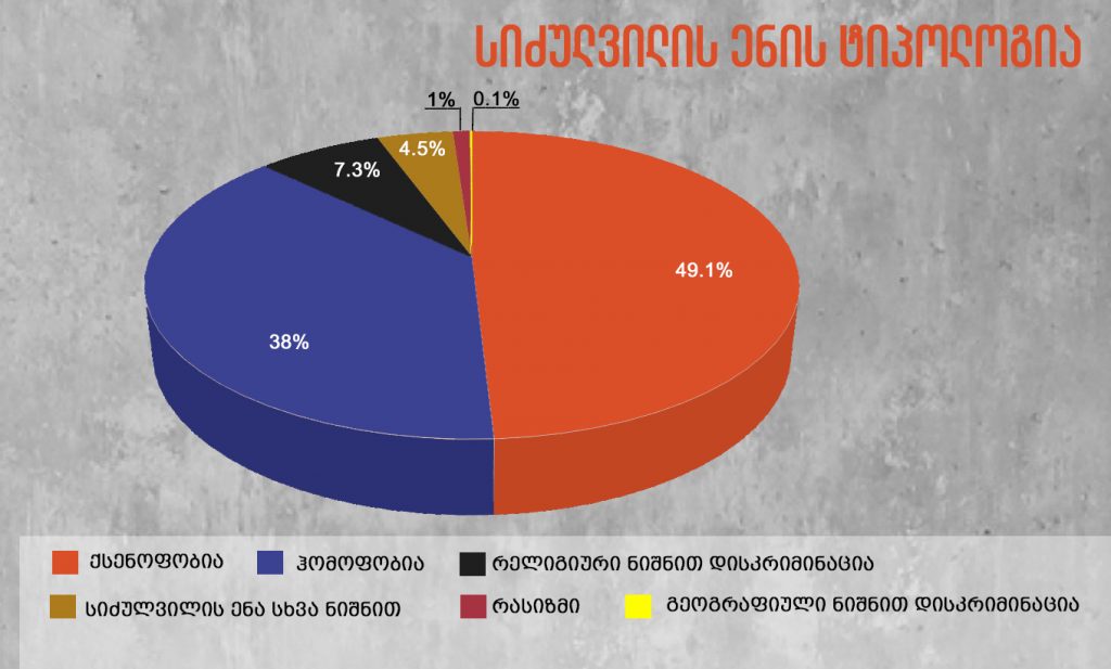 ორგანიზაციის განმარტებით, მონიტორინგისას ასევე გამოიკვეთა რასიზმისა (1 %) და გეოგრაფიული ნიშნით დისკრიმინაციის ფაქტებიც. 20 რასისტული კომენტარიდან ყველაზე მეტი (9) მედიაზე მოდის.