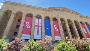 «В Европу», — гласят баннеры на здании Парламента, 26 мая, 2022 года. Фото: Отар Кобахидзе/Civil.ge